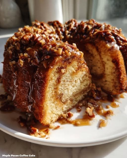 A delicious and easy-to-make coffee cake with a sweet maple glaze and crunchy pecan topping.