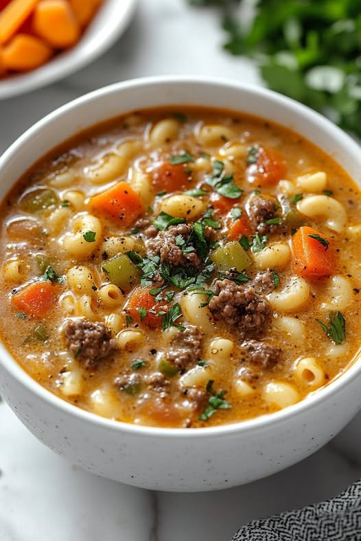 Indulge in a bowl of savory One-Pot Macaroni Cheeseburger Soup, blending the heartiness of ground beef and the comfort of elbow macaroni, all simmered in a flavorful broth enriched with sharp cheddar cheese. Each bite promises the warmth of onions, carrots, and celery, accented by a harmonious mix of oregano and thyme.