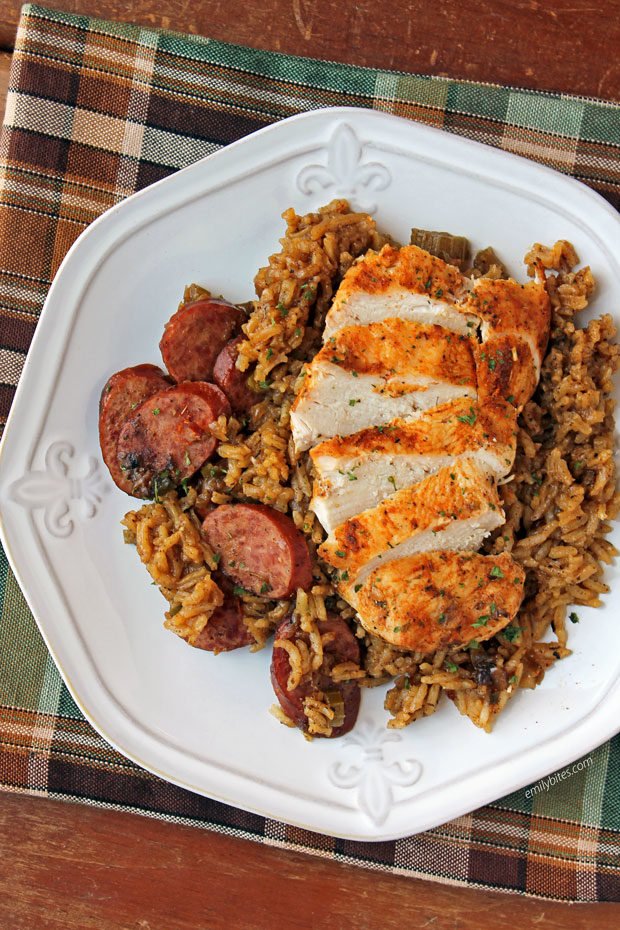 Add the remaining ¼ teaspoon cayenne pepper, salt, black pepper and rice and stir to combine. Add the broth and continue to “deglaze the pan” by scraping up any brown bits off the bottom. Increase the heat to medium and bring the contents to a simmer. Once simmering, add the sausage, chicken, and any juices on the plate back to the pot, placing the chicken in a single layer on top of the other ingredients. Return to a simmer and cover.