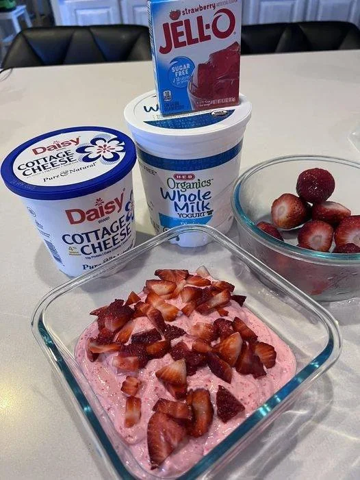 - In a blender, combine the cottage cheese, yogurt, and prepared strawberry Jell-O mixture. Blend until smooth and creamy, ensuring all ingredients are well incorporated.