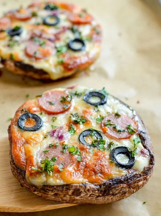 - When the mushrooms have baked for 10 mins. Turn over on the baking sheet, add the pizza sauce, mozzarella and choice of toppings and place bake in the oven and back for an about 15-20 minutes until the cheese is melted and is golden.