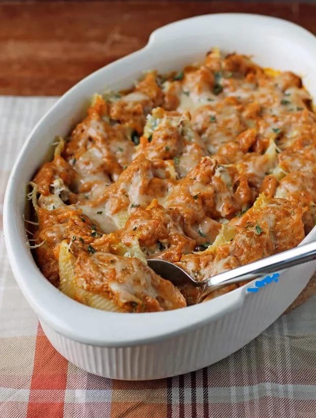 Pre-heat the oven to 350. Spread about ½ cup of the pumpkin sauce across the bottom of a 2 quart casserole dish (such as a 7×11) and set aside. Make sure the pasta shells are cool enough to handle, then use a spoon to stuff them full of the turkey/ricotta filling. Lay the stuffed shells in a single layer in the prepared casserole dish, open side facing up. Pour the remainder of the pumpkin sauce over the top of the stuffed shells to coat evenly. Sprinkle the remaining ounce of shredded Parmesan over the top. Place the dish in the preheated oven and bake for 30 minutes.