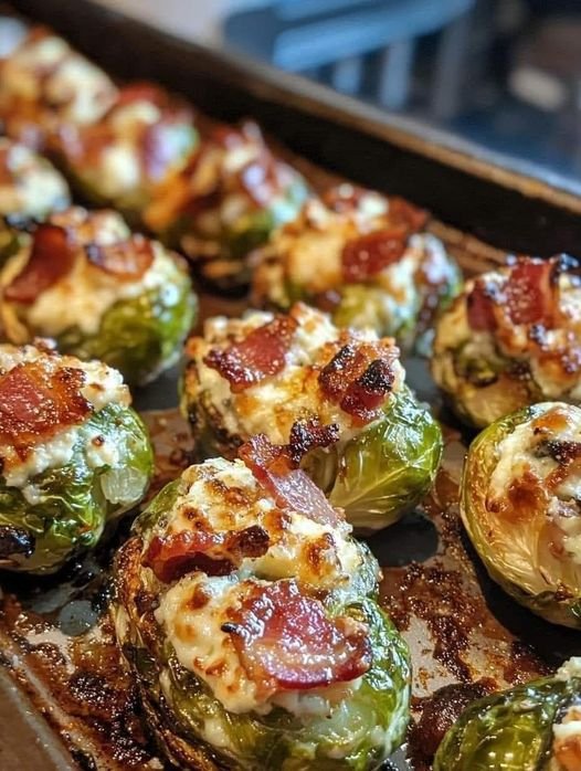 Return the stuffed Brussels sprouts to the oven and bake for an additional 5-7 minutes, until the feta is slightly melted and the bacon is warmed through.
