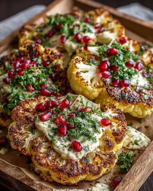 Golden roasted cauliflower steaks topped with a creamy lemon-tahini drizzle and fresh pomegranate seeds. A vibrant, satisfying plant-based dish that feels both comforting and elegant.