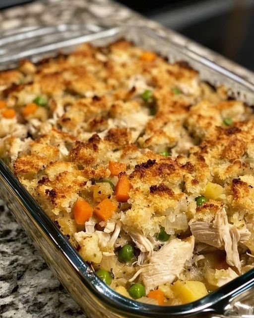 This comforting casserole combines tender rotisserie chicken with a creamy, savory blend of vegetables and seasonings, all topped with a golden layer of stuffing. It’s a perfect one-dish meal for a cozy family dinner or a simple yet delicious potluck dish. The addition of cheddar cheese provides an extra layer of richness, but it’s optional if you prefer a lighter version. Whether you’re using store-bought or homemade cream of chicken soup, this dish delivers warmth and satisfaction with every bite.