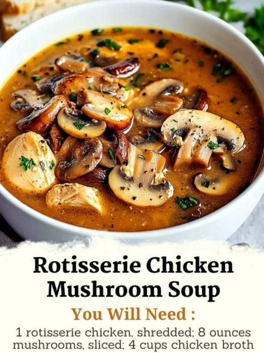 Here’s a comforting, easy-to-make recipe for Rotisserie Chicken Mushroom Soup—perfect for chilly days, quick weeknight meals, or using up leftover rotisserie chicken. It’s creamy, hearty, and full of earthy mushroom flavo