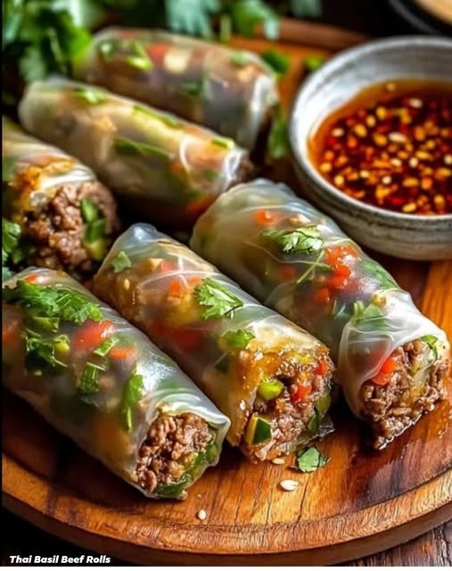 Lettuce leaves (butter lettuce or iceberg) or rice paper wrappers Julienned carrots Sliced cucumbers Thin bell pepper strips 🔪 Instructions Cook the beef Heat a pan over medium-high heat. Add ground beef and cook until browned, breaking it apart (5–6 minutes). Add aromatics Stir in garlic, ginger, and chilies. Cook for 1–2 minutes until fragrant. Build flavor Add soy sauce, fish sauce, oyster sauce, and sugar. Stir well and cook another 2–3 minutes. Finish with basil Turn off heat and fold in Thai basil until wilted. Drizzle sesame oil. Assemble rolls Lettuce wraps: Spoon filling into leaves and top with veggies Rice paper rolls: Soften wrappers, add filling + veggies, then roll tightly 🥣 Optional Dipping Sauce 2 tbsp soy sauce 1 tbsp lime juice 1 tsp honey 1 tsp chili paste or sriracha