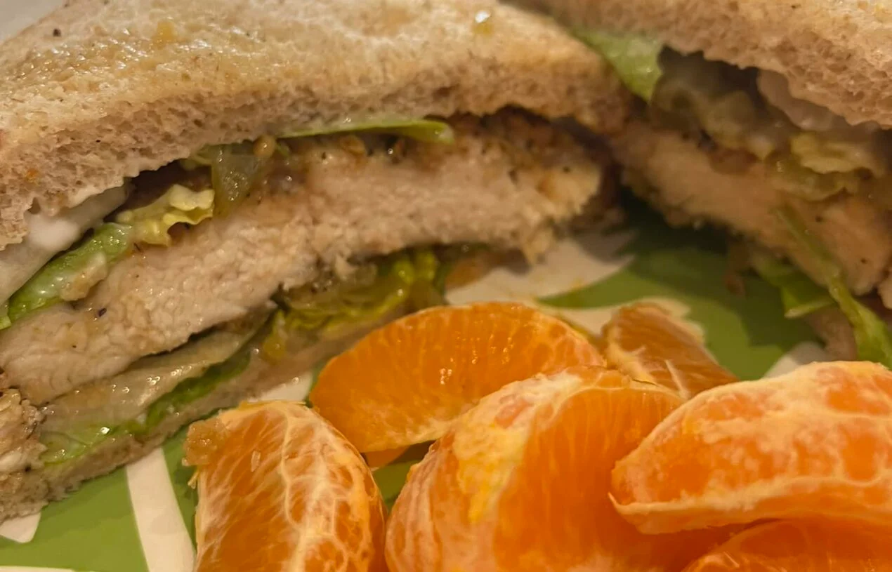 5. Assemble and Enjoy: Place the slice of bread with the mayo over the chicken and toppings, creating a sandwich. Press gently to secure the layers together.