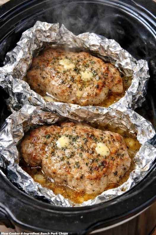 If you prefer bone-in pork chops, use them in the same way and simply add about 30 minutes to the cooking time on LOW; the bones add a bit more flavor and still become wonderfully tender in the foil. For a creamier version, you can replace half of the chicken broth with canned evaporated milk or a splash of heavy cream, which will give you a richer sauce without changing the basic four-ingredient idea. If your family likes a little kick, add a light sprinkle of crushed red pepper or black pepper on top of the ranch seasoning before sealing the foil. To stretch the meal, tuck a few thinly sliced onions or mushrooms under the chops in each packet, knowing that technically you’re adding ingredients but staying true to the same simple method my uncle used. Leftovers reheat nicely: keep the meat in its foil packet, place it back in the slow cooker with a bit of water in the bottom, and warm on LOW until heated through so the chops stay moist and tender.