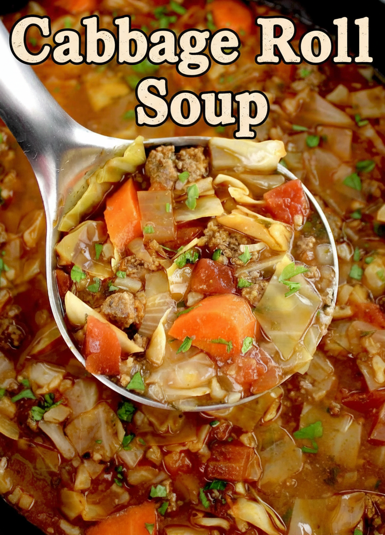 Transfer meat mixture to the slow cooker. Add cabbage, carrots, celery, diced tomatoes, tomato sauce, broth, and seasonings.