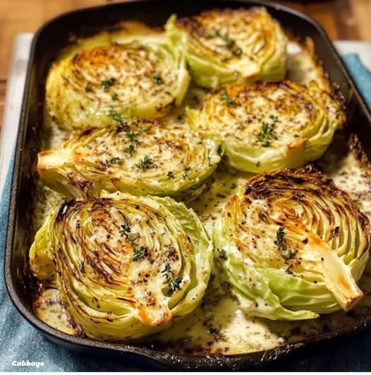 A beautifully tender whole cabbage, slow-cooked until silky inside, brushed with garlic lemon butter, finished with Parmesan, and lightly caramelized. Elegant enough for guests, easy enough for weeknights.