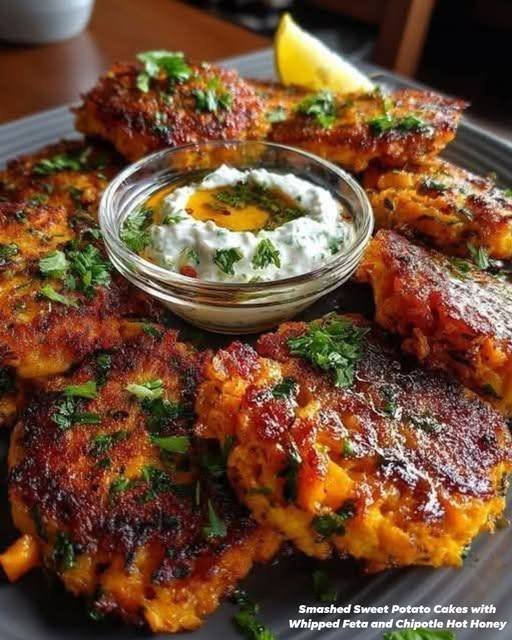 Smashed Sweet Potato Cakes with Whipped Feta & Chipotle Hot Honey