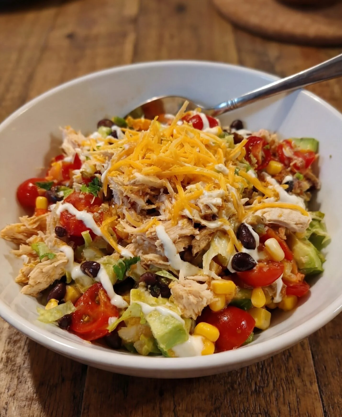 • A: You can prep the salad ingredients in advance (chop veggies, shred the chicken) and store them in separate containers in the fridge. However, it’s best to add the avocado and dressing just before serving to keep everything fresh.