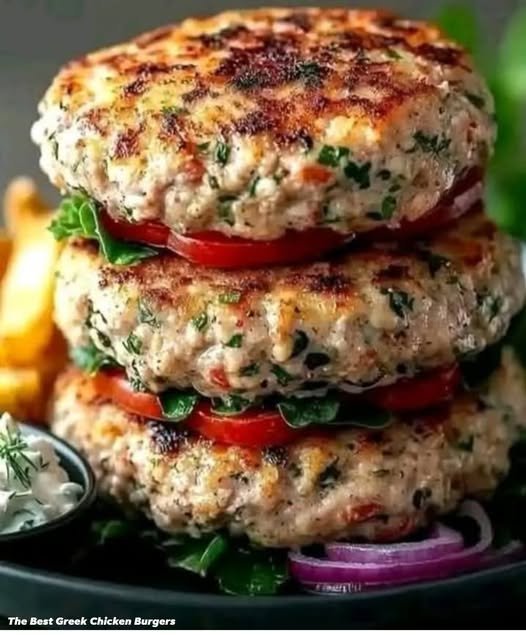 🍔 The Best Greek Chicken Burgers  🧾 Ingredients For the burgers: 500g ground chicken 2 cloves garlic, minced ¼ cup red onion, finely chopped ¼ cup fresh parsley, chopped 1 tbsp fresh oregano (or 1 tsp dried) 1 tsp ground cumin 1 tsp paprika ½ tsp salt ½ tsp black pepper 1 tbsp lemon juice 2 tbsp whole wheat breadcrumbs (optional, for binding) 1 egg For the tzatziki sauce: 1 cup plain Greek yogurt ½ cucumber, grated & squeezed dry 1 clove garlic, minced 1 tbsp lemon juice 1 tbsp fresh dill (or mint) Salt to taste For serving: Whole wheat burger buns or pita Tomato slices 🍅 Lettuce 🥬 Red onion slices Optional: feta cheese crumbles 👩‍🍳 Instructions 1. Make the patties