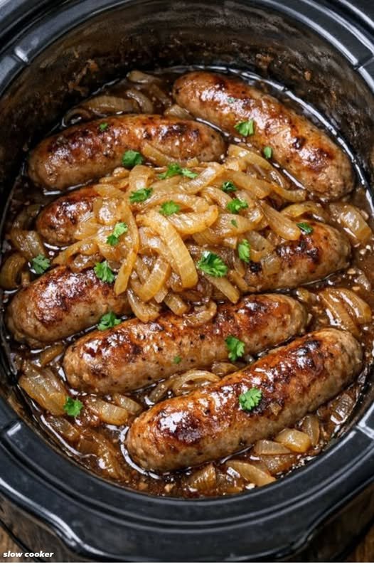Slow cook until tender: Cook on LOW for 6–8 hours, or on HIGH for 3–4 hours, until the onions are very soft and translucent, the sausages are cooked through and tender, and the liquid has darkened into a rich brown onion gravy.