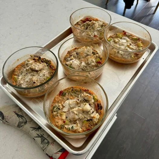 Place 5oz of chicken in each bowl and bake at 350 for 40 minutes.