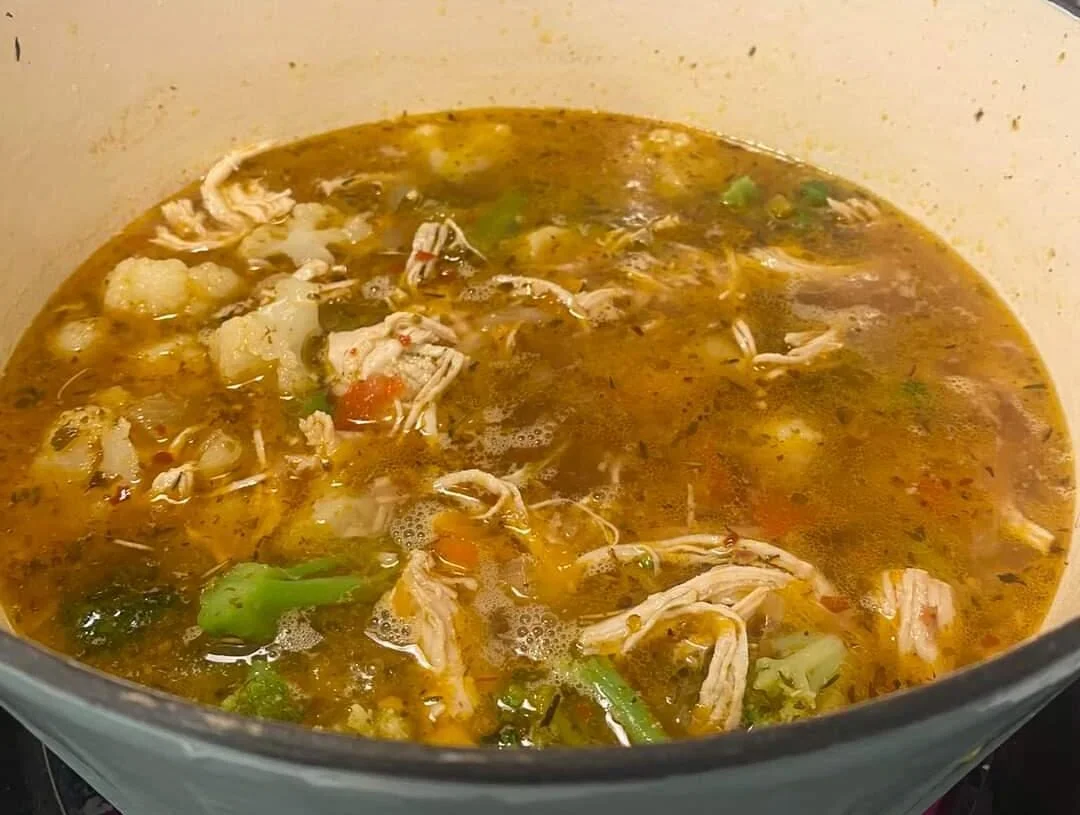 - Set a large sauce pot over medium heat. Add the olive oil, chopped onions, celery, ginger, and garlic. Saute for 5-6 minutes to soften. Then add the raw chicken breasts, broth, carrots, apple cider vinegar, crushed red pepper, turmeric and 1 teaspoon sea salt.