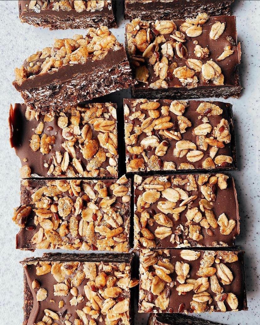 6. Pour ⅘ of the chocolate mixture into the pan over the pressed oats, reserving about ¼ cup for drizzling. Top with the remaining oats and drizzle with the remaining ¼ cup chocolate mixture.