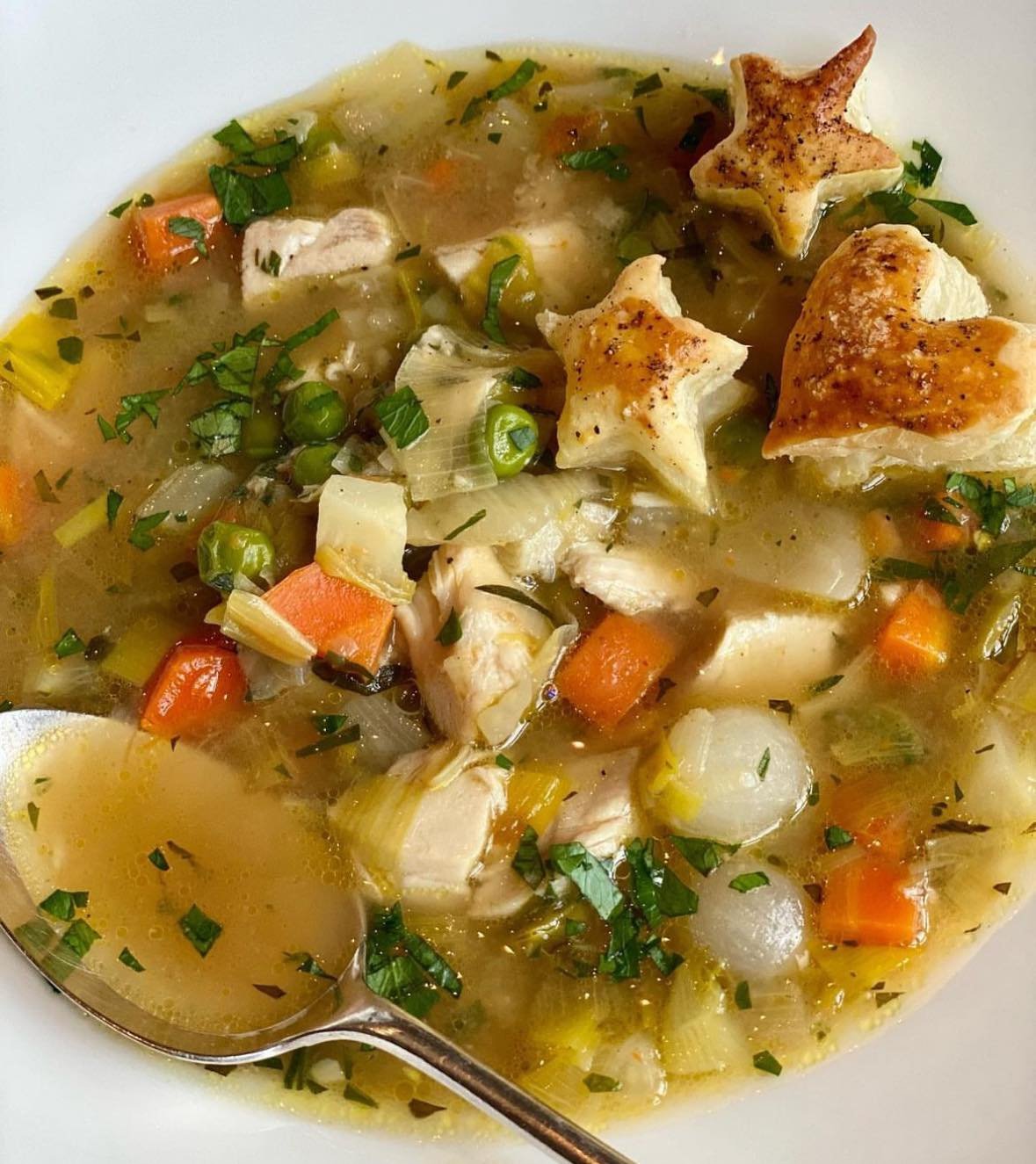 - Add shredded chicken, frozen peas, and frozen corn, 1/2 cup heavy whipping cream and 1/4 cup parsley. Bring back to a simmer and continue to cook for another 5 minutes or until peas and corn are tender. Season to taste with salt and pepper and remove from heat.