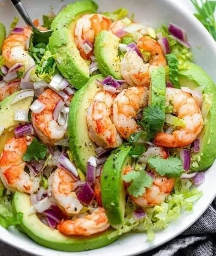 - Assemble the Salad: In a large mixing bowl, combine the cooked shrimp, diced avocado, halved cherry tomatoes, diced cucumber, thinly sliced red onion, and chopped cilantro. Toss gently to combine.