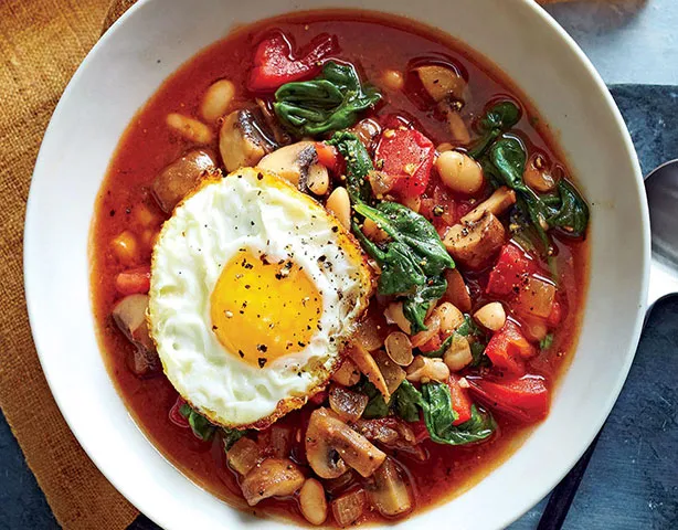 10. Divide the bean mixture among 4 shallow bowls, topping each serving with 1 egg. Drizzle with vinegar and