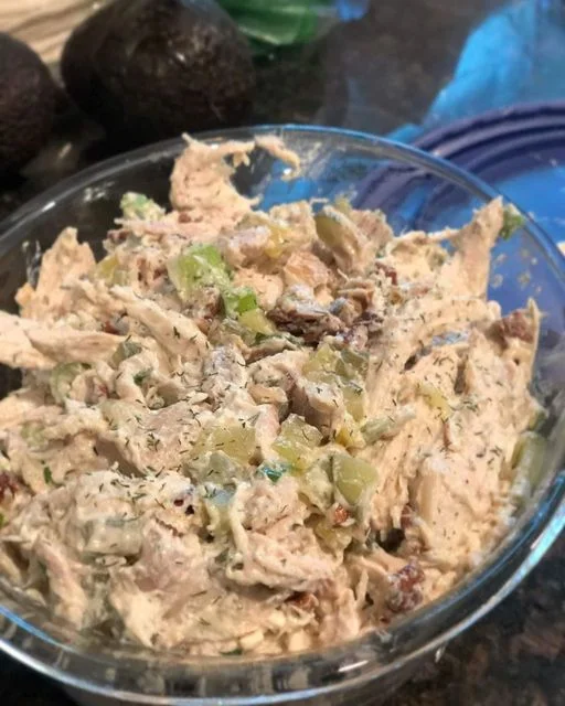 A Symphony of Freshness: At the heart of this chicken salad lies a symphony of fresh ingredients. Tender cooked chicken breast provides a protein-packed base, while crisp dill pickles and celery add a satisfying crunch. Chopped fresh dill infuses the salad with vibrant herbal notes, while a creamy dressing made from non-fat Greek yogurt and zesty Dijon mustard brings everything together in perfect harmony.